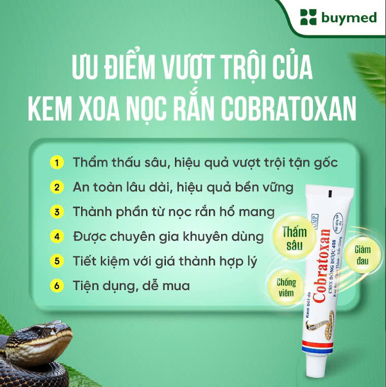 Thành phần an toàn, không gây tác dụng phụ: Nọc rắn hổ mang từ Trại rắn Đồng Tâm Thuộc Cục Hậu Cần - Kỹ Thuật, Quân Khu 9 được kiểm soát chặt chẽ. Nọc rắn được chiết xuất tinh khiết theo quy trình khoa học. Được kiểm nghiệm nghiêm ngặt, đảm bảo an toàn, hiệu quả cao và không gây kích ứng da, không tác dụng phụ.
